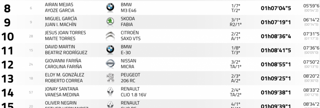 Quintos eran Marco Lorenzo y Néstor Gómez (Mitsubishi Lancer Evo IX), seguidos de unos sorprendentes Adrián Chávez y Arunzu Quintero (Peugeot 205 BR15), que demuestran que cuando la mecánica les respeta pueden lograr grandes resultados, y de Jonathan Morales y Fran Perestelo (Renault Clio Cup 2), que finalizaron séptimos.