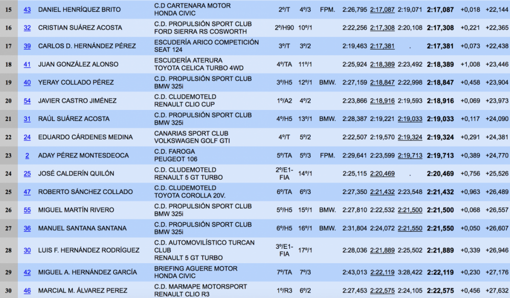 Como viene siendo habitual en las citas del Campeonato Provincial de Las Palmas de Montaña, el segundo puesto fue para Miguel Cabral (Mitsubishi Lancer Evo X), a más de cuatro segundos, siendo el tercer puesto para Julio Martínez Porsche 996 GT3, a menos de un segundo y medio del segundo lugar.