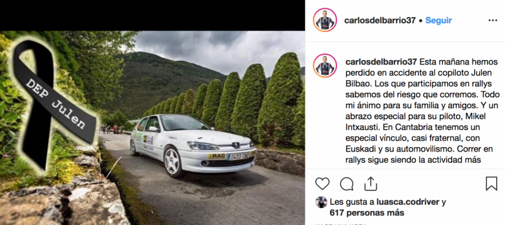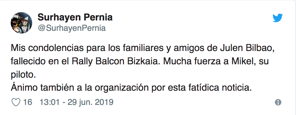 El mundo de los rallies se ha volcado en mensajes de condolencias hacia la víctima del choque. Surhayen Pernía, piloto de Hyundai en el campeonato de España de rallies, o Carlos del Barrio, copiloto de Dani Sordo en el Mundial, han mostrado su pésame en las redes sociales.