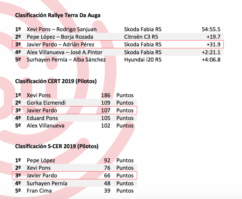 Javier se mostraba contento al final del rallye, sacando conclusiones positivas de los cambios que está tratando de hacer en su conducción, y con un ritmo muy alto en la parte final de la prueba: “Es una pena que no empiece ahora otra etapa, porque en este momento ya voy cómodo y con buen ritmo para optar a ganar.”