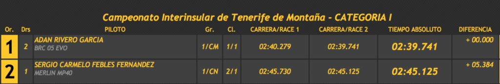 Entre las barquetas Adan Rivero fue el más rápido con su BRC 05 EVO, siendo 05.384 más rápido que Sergio Carmelo Febles (Merlin MP40).