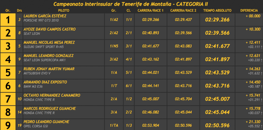 Lauren marcó un 2:29.266 inicial y empeoró en la segunda oficial con un 2:29.437, peor le valía par ser en más rápido y superar en 10.300 a su paisano Ayoze David Campos (Seat León MK1), segundo, que lograba superar en 2.111 a Manolo Mesa (Suzuki Swift Sport R+ N5), tercero.