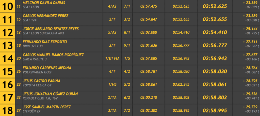 Gran novena posición para Pedro Leandro Guanche con su Opel Corsa, cerrando las diez primeras posiciones Melchor Dávila (Seat León MK1).
