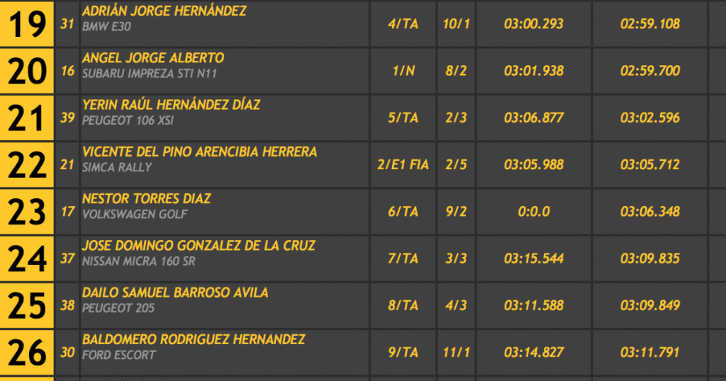 La séptima plaza la ocupa Octavio Hernández en su regreso con su Honda Civic Type R, superando en solo 0.037 a Marcos Rodríguez, con idéntica unidad.