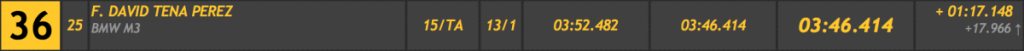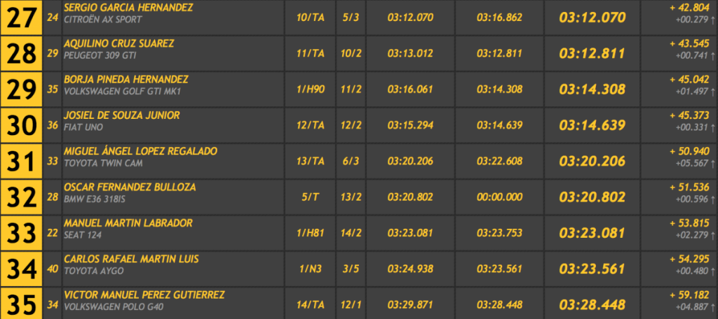 Sexto fue Armando Díaz (BMW M3 E36), que después de no poder participar en la Subida de Arucas, pudo hacerlo ante los suyos y quedarse a solo 0.187 del quinto lugar.