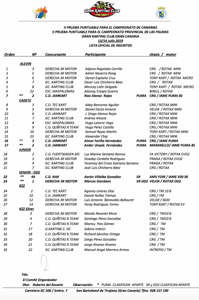 Mucho tiempo que no se veía en Gran Canaria tanta expectación y participación para una prueba de karting, haciendo presagiar que se puede ver un bonito espectáculo, donde se contará con 7 pilotos de Alevines, 10 pilotos Cadetes, 4 Junior al que se les unirá dos participantes Senior y en la categoría KZ, que son kart’s con cambios, habrán 12 (4 KZ2, y 8 KZ2 Silver).
