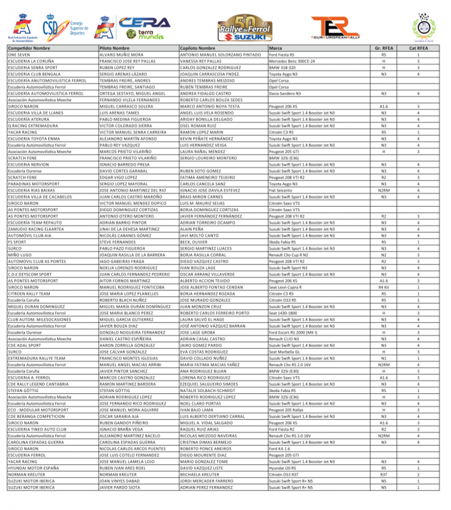 Destaca en la lista la gran presencia de los Suzuki Swift Sport que con veintitrés participantes vuelve a ser la Copa de Promoción por excelencia en el CERA. En esta ocasión, también estarán presentes en el Rallye de Ferrol los participantes Júnior de la Copa Kobe Motor (Toyota), en su única participación de la temporada sobre asfalto.