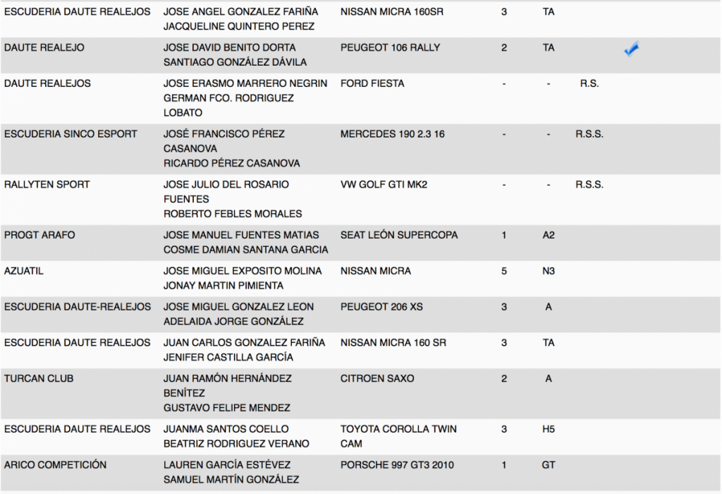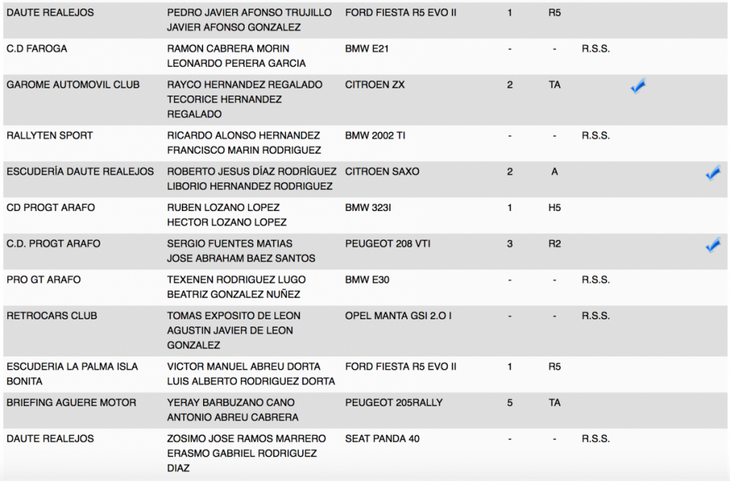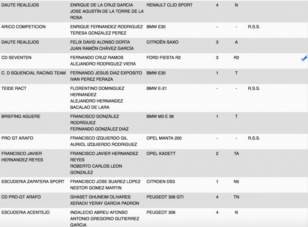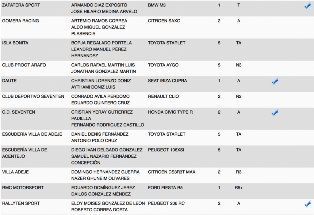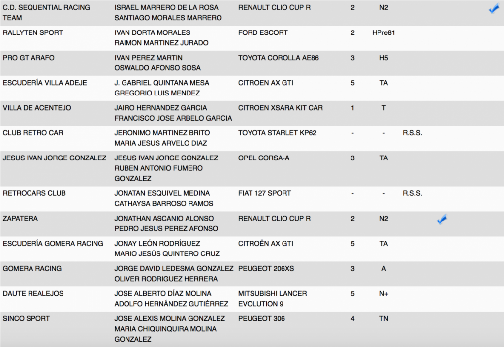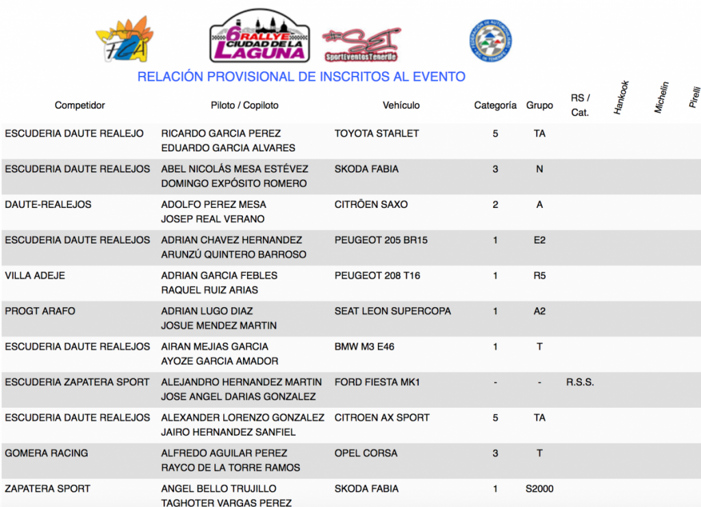 Publicamos la relación de los 85 equipos inscritos en el VI Rallye Ciudad de La Laguna, donde estarán los Porsche 911 GT3 de Lauren García y Neftali Martín; los Ford Fiesta R5 de Eduardo Domínguez, Víctor Abreu y Javi Afonso; el Peugeot 208 T16 R5 de Adrián García; el Suzuki Swift Sport R+ N5; el Skoda Fabia S2000 de Ángel Bello, entr otros.
