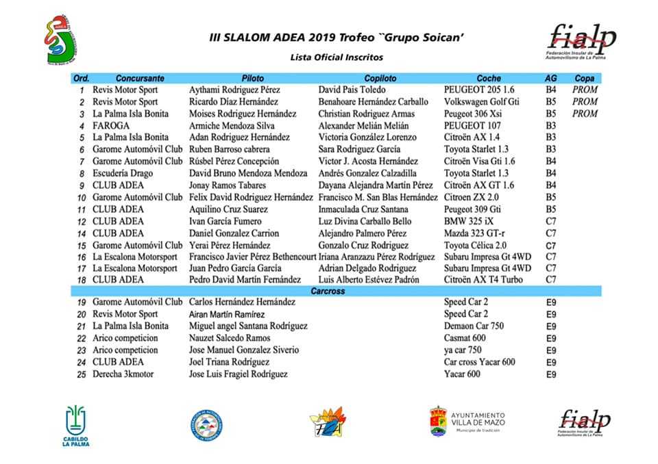 Lista oficial de inscritos del III Slalom Adea 2019 Por Rafa León Última actualización: 17/07/2019 14:13 Compartir FacebookTwitterWhatsAppEmailTelegramLinkedin Adea Mazo ha publicado la lista oficial de inscritos para el III Slalom Adea 2019 Trofeo Grupo Soican, campeonato patrocinado por Autos Pedro. ADEACampeonato Insular de La PalmaCanariasClub ADEALa PalmaSlalom de Adea Compartir