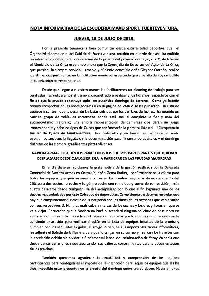 La Escudería Maxo Sport desvela el Informe favorable por parte del Cabildo de Fuerteventura, por lo que se disputará el VII Slalom Naviera Armas Concejalía de Deportes este domingo 21.