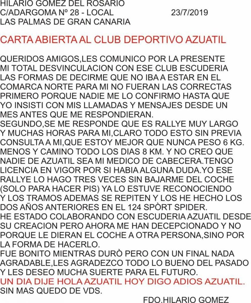 El veterano piloto grancanario Hilario Gomez del Rosario, que en la Subida de Moya 2018 decidía colgar los guantes y dejar la competición activa, ha escrito una carta de despedida de la Escudería Azuatil al no estar conforme con las formas que se han tenido con él al no informarle de que no sería el coche 0 del Rally Comarca 2019.