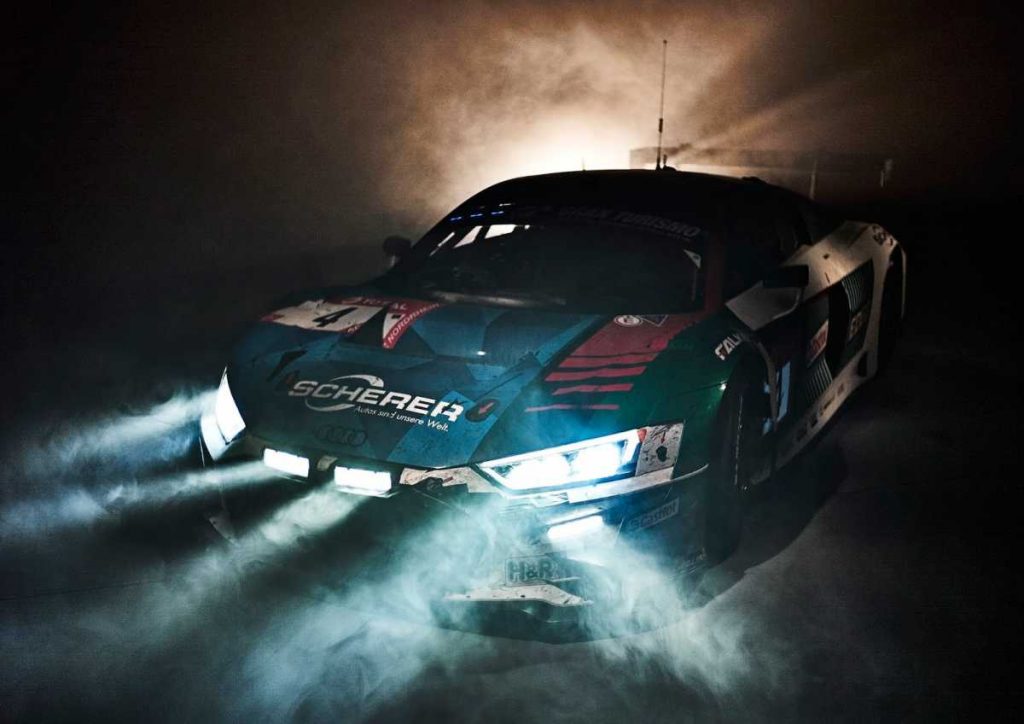 El Nordschleife, el trazado largo de Nürburgring donde se disputan las 24 Horas, es una montaña rusa de 25,378 kilómetros muy respetada por los pilotos de todo el mundo: sigue manteniendo su carácter de “Infierno Verde”. A pesar de las difíciles condiciones de la pista, Audi –a diferencia de otros fabricantes– solo hizo pequeñas modificaciones en su coche para adaptarlo al circuito. La distancia al suelo de 70 milímetros según la normativa significaba que el GT3 se encontraba un centímetro más alto en el asfalto que en otros circuitos. También debido a la limitación que imponía un alerón trasero 100 milímetros más delgado, la carga aerodinámica se vio reducida. A pesar de ello, el deportivo mantuvo su facilidad de conducción y, tanto los ingenieros de pista, los pilotos y el equipo al completo realizaron una fantástica actuación durante todo el fin de semana.