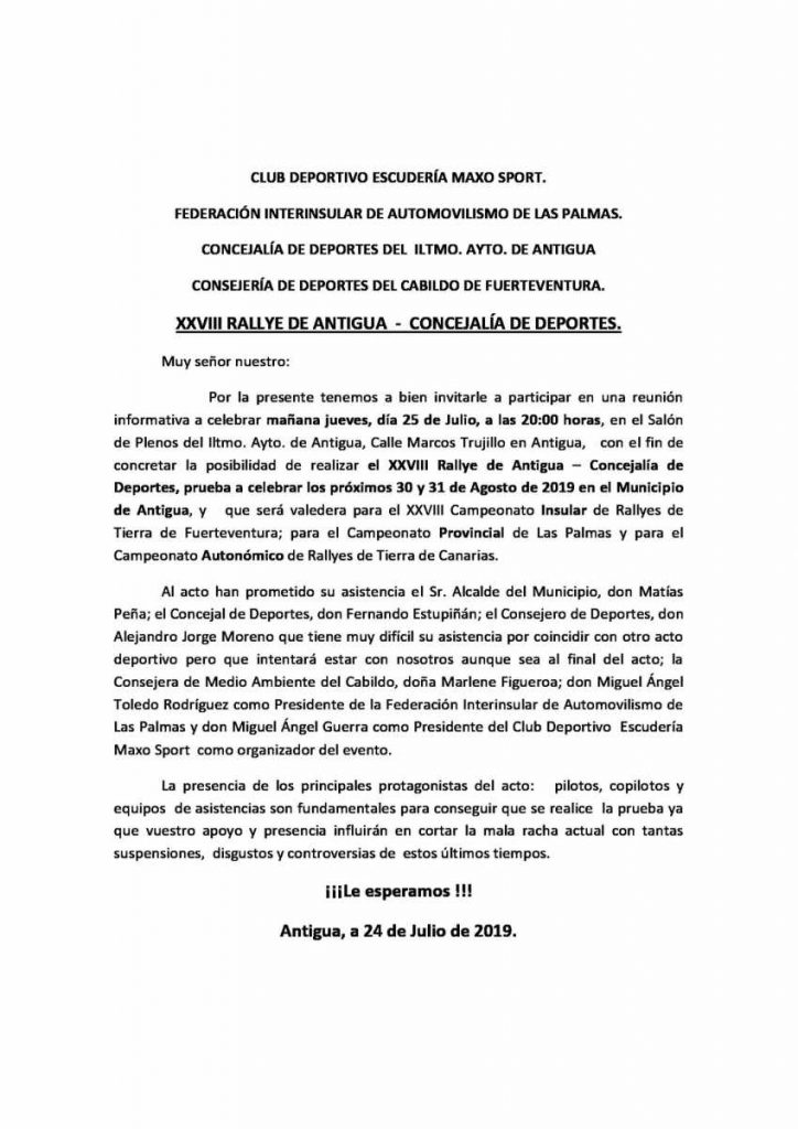 El Club Deportivo Escudería Maxo Sport, presidido por el incansable y siempre trabajador por el mundo del motor en la isla de Fuerteventura Miguel Ángel Guerra, convoca una reunión para intentar sacar adelante una nueva edición del Rallye de Antigua.