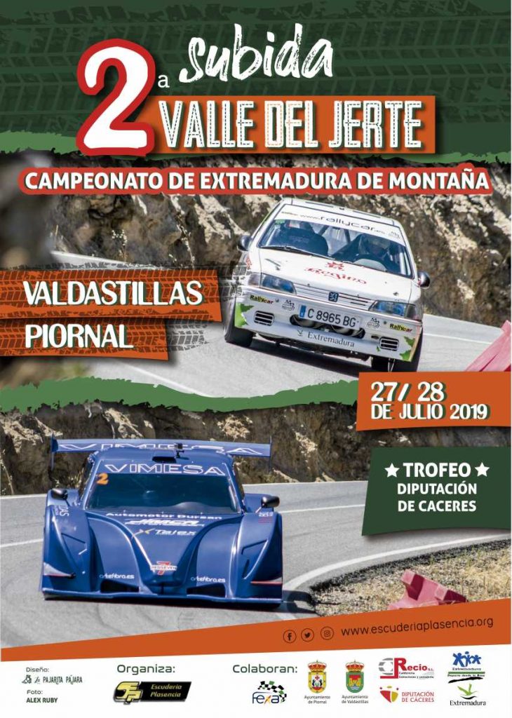 La Subida Valle del Jerte será valedera para el Campeonato de Extremadura de Montaña de Turismos y Monoplazas y se celebrará en la carretera CC-17.5, entre los pueblos de Valdastillas y Piornal. El recorrido total del tramo, al que realizarán tres pasadas, es de 5,529 kilómetros con una altitud de 645 metros. El sábado 27 de julio se celebrarán a partir de las 16 horas las dos mangas de entrenamientos oficiales, para a continuación acoger la primera carrera. En la matinal dominical, a partir de las 09:30 horas se desarrollará una nueva tanda de entrenamientos para posteriormente disputarse la segunda y tercera carrera que pondrán punto y final a la competición.