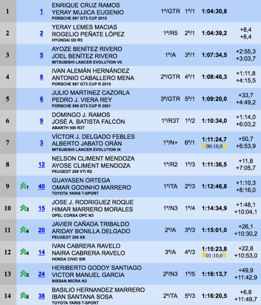 Terceros fueron los hermanos grancanarios Benítez, Ayoze y Joel, que con un Mitsubishi Lancer Evo VII de grupo A siempre se movieron en el último escalón del podio, aunque muy lejos de los dos primeros, a 3:03,7 del primer puesto y a 2:55,3 del segundo, pero no viendo peligrar el último escalón del podio puesto que aventajaron a Iván Alemán-Antonio Caballero (Porsche 911 GT3), cuartos, en 1:11,8.