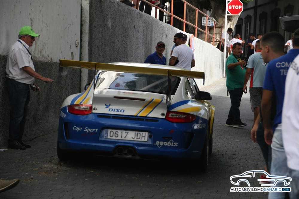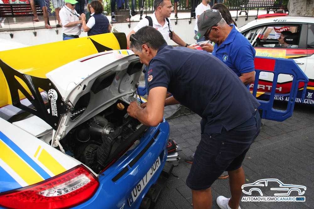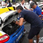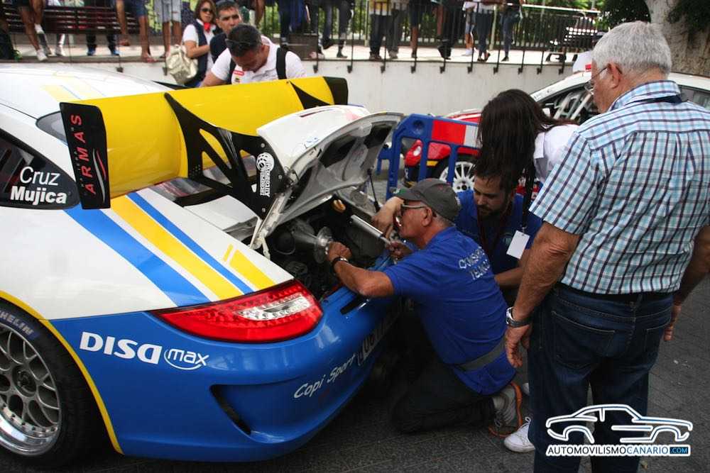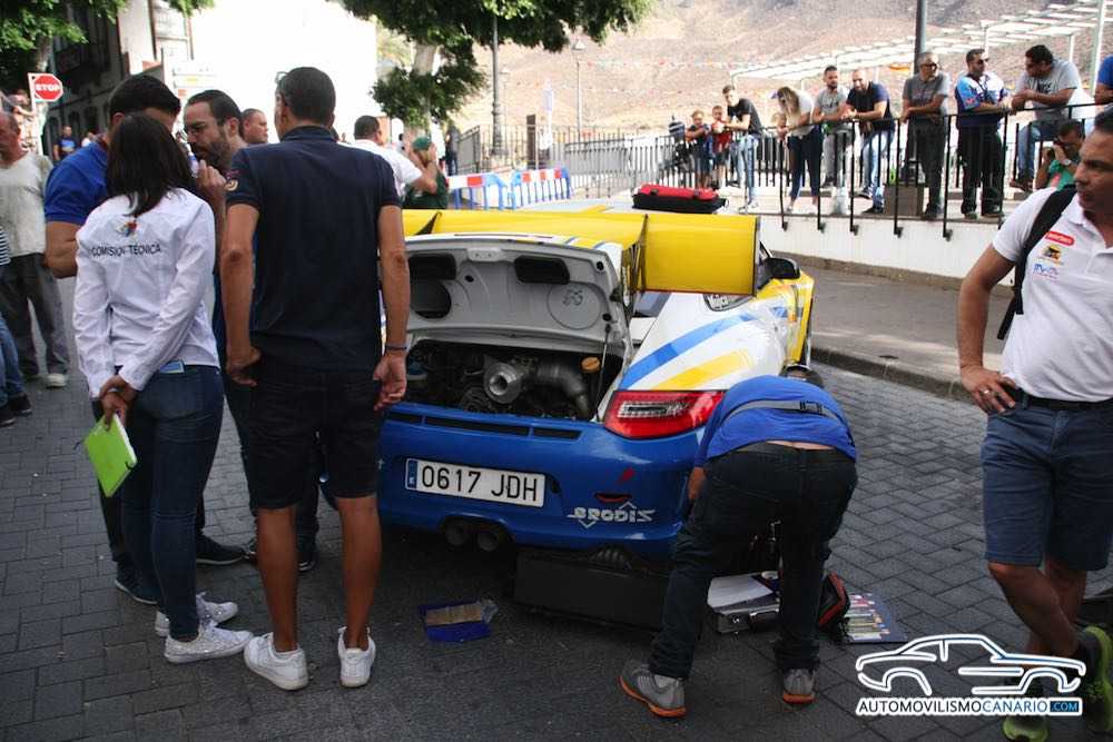 Los comisarios técnicos de la Federación y Berto Rodríguez, mecánico de Copi Sport, nos enseñan cómo se controla que la brida del Porsche 911 GT3 de Enrique Cruz está correcta.