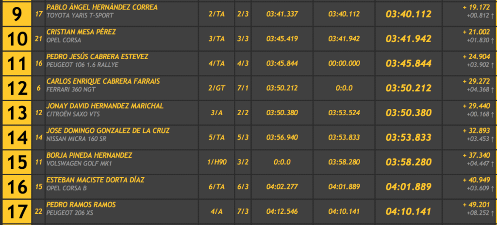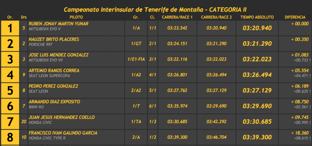 Sorpresón mayúsculo en la isla de La Gomera con la currada victoria del tinerfeño Rubén Jonay Martín (Mitsubishi Lancer Evo V), que lleva muchos meses realizando actuaciones realmente destacadas, que logró superar a su paisano y uno de los grandes favoritos al triunfo, Nauzet Brito (Porsche 997 GT3), en tan solo 0.350.