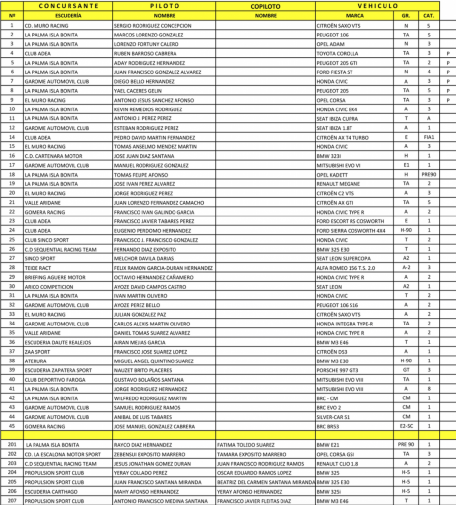 El certamen promocional también aportará un número importante de equipos, completando la ventana de los Turismos un apartado de Fórmula-Rallye que ha quedado integrado por siete equipos, además, representando a diferentes islas del archipiélago en las figuras de Antonio Medina-Francisco Fleitas (BMW M3 E46) o Zebensuí Expósito-Tamara Expósito (Opel Corsa GSI), entre otros.