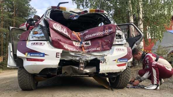 La ventaja de Loubet aumentó a más de un minuto cuando el francés midió su ritmo en busca de una tercera victoria consecutiva con su Fabia. Sin embargo, en la última especial de Leustu, escuchó mal una nota en una curva cerrada y la parte trasera de su coche se estrelló contra un árbol.