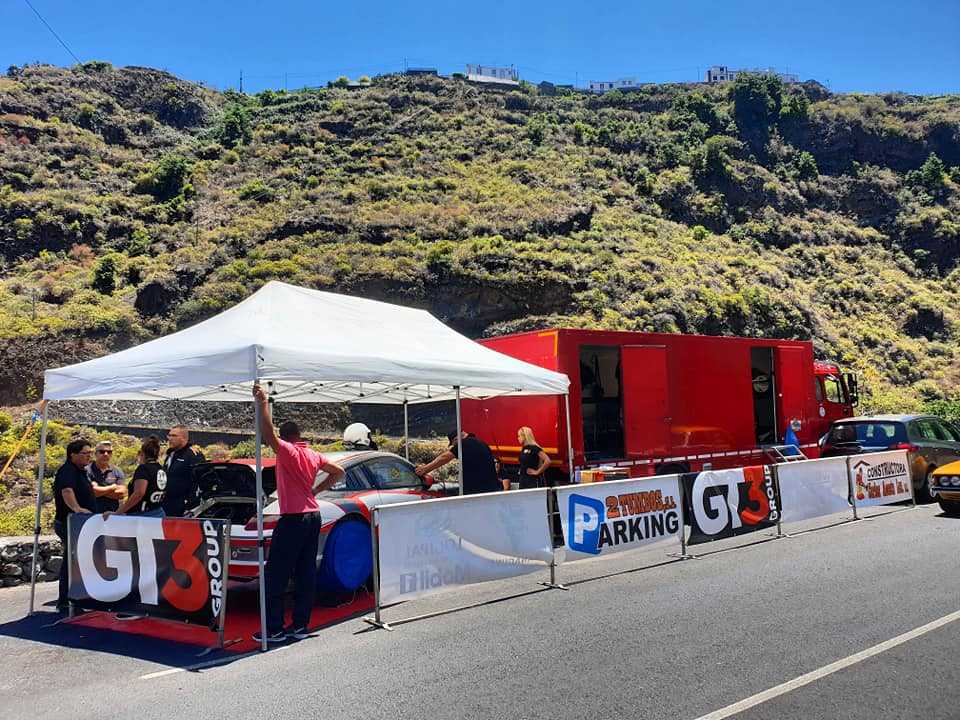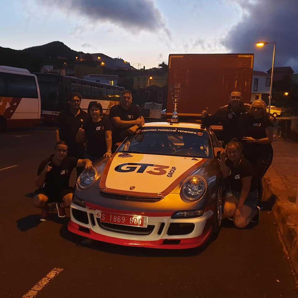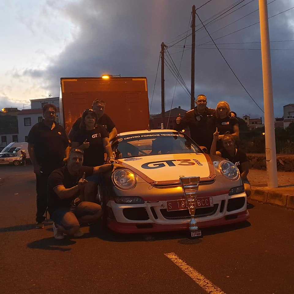 El tinerfeño Cristofer Brito, hermano de Nauzet Brito, ganador de la Subida a Barlovento con su Porsche 997 GT3, muetra su alegría por este nuevo triunfo del equipo GT3 Logística Canaria.