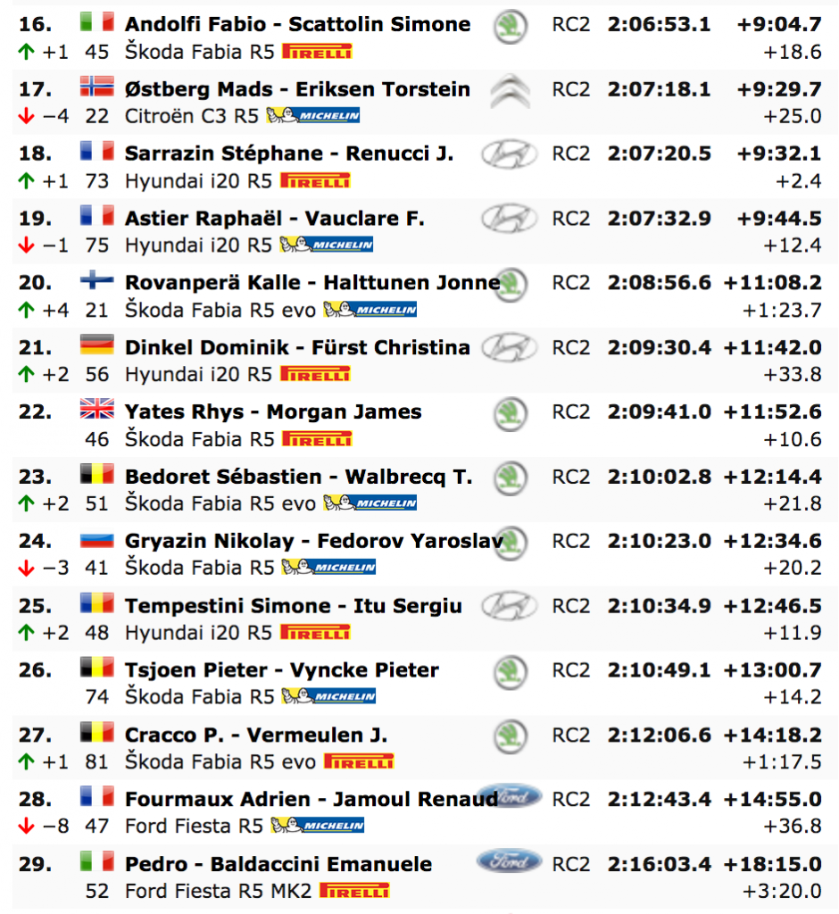 Tampoco fue una gran tarde para Sébastien Ogier. Se mantuvo tercero con su Citroën C3, pero fue superado por Kris Meeke y Jari-Matti Latvala en la larga especial, mientras que el Toyota Gazoo Racing se ha situado copando las plazas del podio.