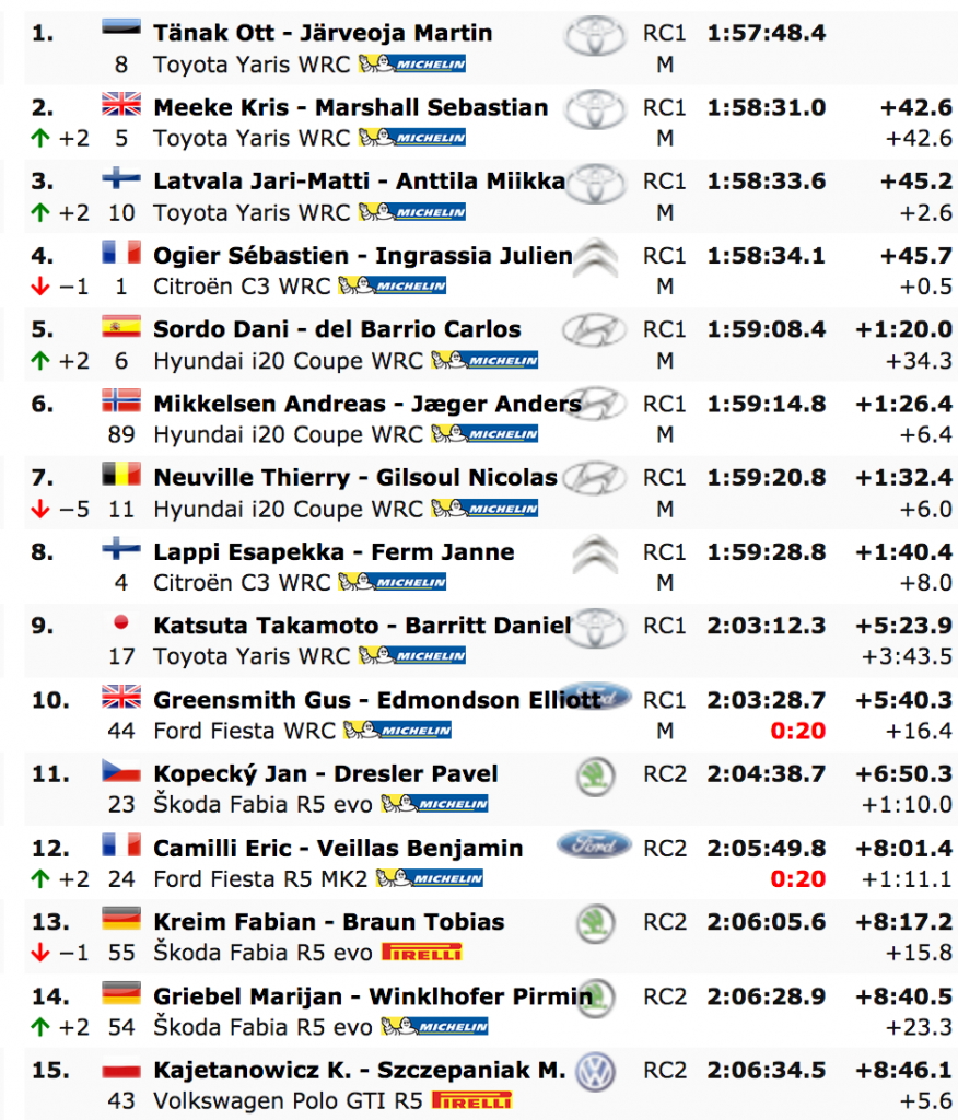 Tampoco fue una gran tarde para Sébastien Ogier. Se mantuvo tercero con su Citroën C3, pero fue superado por Kris Meeke y Jari-Matti Latvala en la larga especial, mientras que el Toyota Gazoo Racing se ha situado copando las plazas del podio.