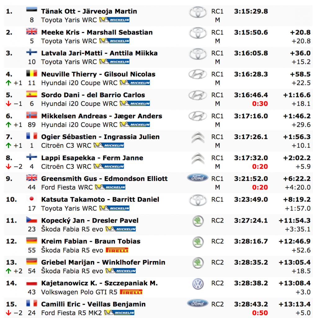 Tänak terminó 20,8 segundos por delante del irlandés Kris Meeke, y el finlandés Jari-Matti Latvala, 15,2 segundos más tarde, en tercer lugar.