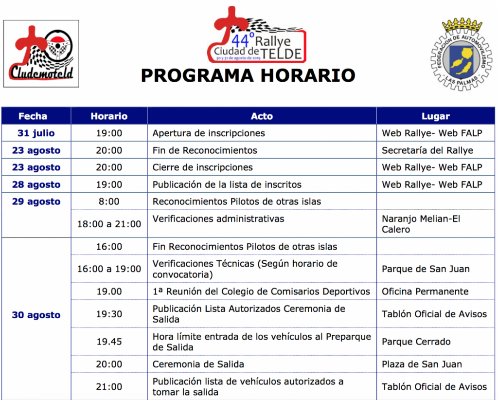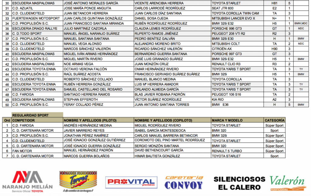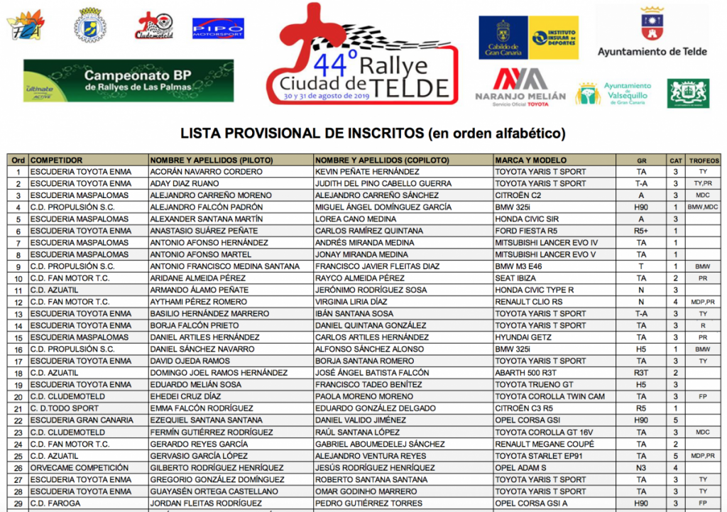 Lista provisional de inscritos del Rally Ciudad de Telde Por Rafa León Última actualización: 27/08/2019 10:18 Compartir FacebookTwitterWhatsAppEmailTelegramLinkedin Lista provisional de inscritos del Rally Ciudad de Telde por orden alfabético y programa horario. Campeonato de Las PalmasCanariasLas PalmasRally Ciudad de TeldeTelde Compartir