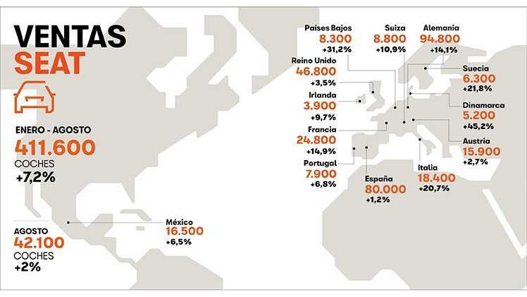 Entre enero y agosto, las ventas mundiales de SEAT crecen principalmente por el impulso en los resultados de Alemania, Francia e Italia. Alemania (94.800 vehículos; +14,1%), España (80.000; +1,2%) y el Reino Unido (46.800; +3,5%) se mantienen como los tres mercados de mayor volumen. En Alemania y en el Reino Unido, SEAT obtiene hasta agosto el mejor resultado histórico de ventas, y en España es la marca más vendida y amplía la diferencia respecto a sus competidores. Francia e Italia completan el top 5 de mercados, con un crecimiento del 14,9% (24.800 vehículos) y del 20,7% (18.400), respectivamente.