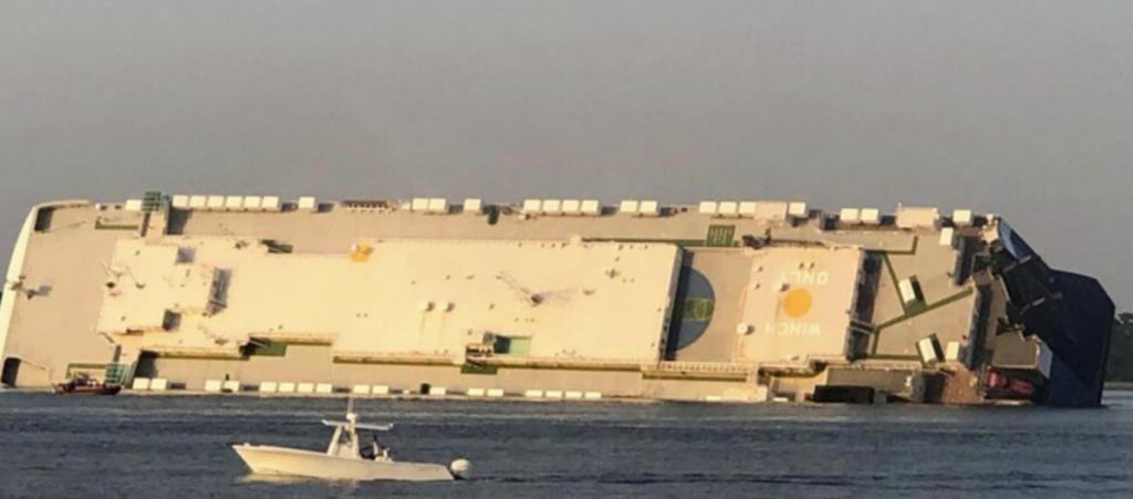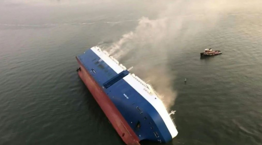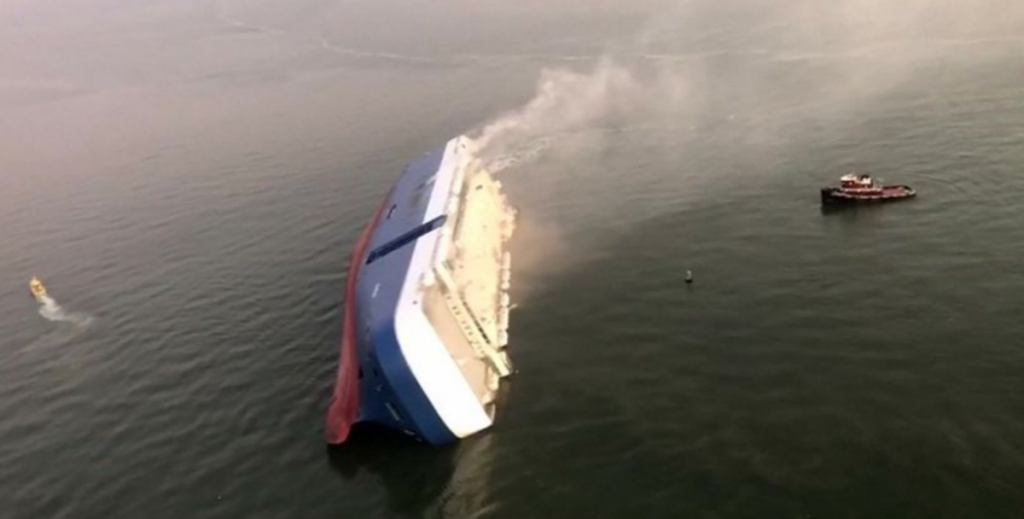El barco lleva bandera de las islas Marshall y transportaba más de 4.000 autos de las marcas Hyundai y Kia Motors cuando volcó.