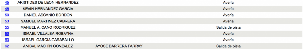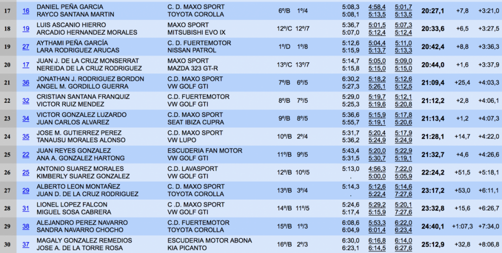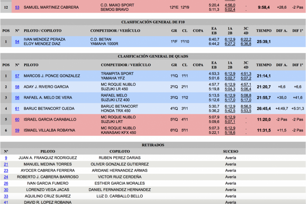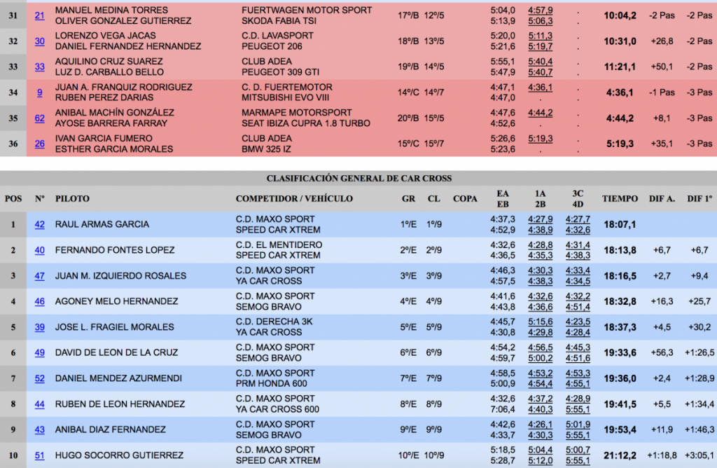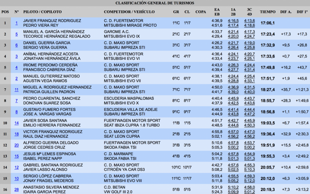 Fránquiz y Viera fueron los más rápidos en las cuatro mangas oficiales, superando en 17,3 a Nolito García y Teco Hernández (Mitsubishi Lancer Evo IX). El tercer lugar fue a parar a manos de Daniel Guerra y Sergio Vera (Subaru Impreza STI), que se quedaban a 26,8 del liderato, a 9,5 del segundo lugar y superando en solo 0,7 a Aníbal Hernández y Jonathan Hernández (Mitsubishi Lancer Evo VI).