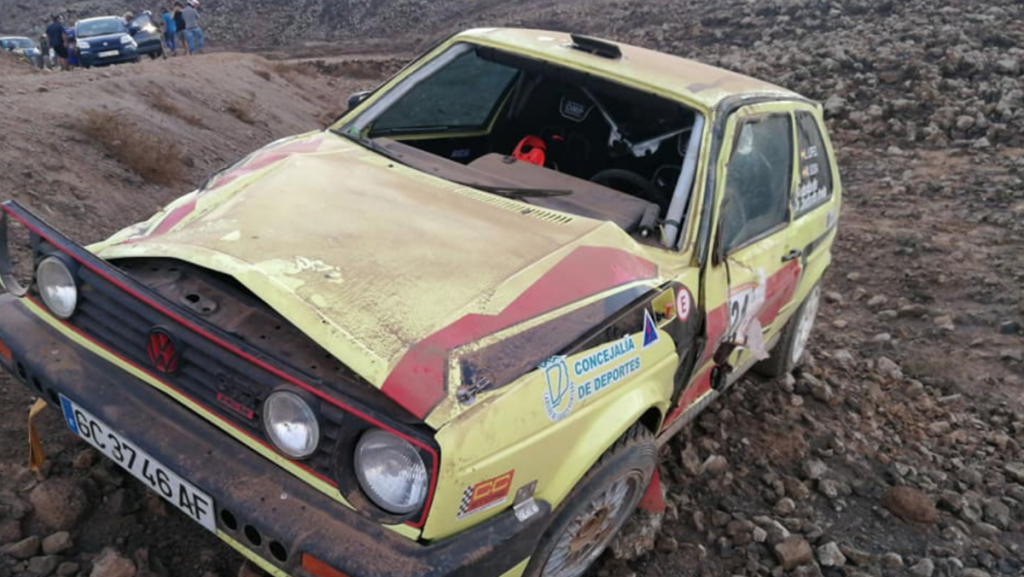 Lionel López y Miguel Sosa (VW Golf GTI) no tuvieron la suerte de cara en el Slalom La Picona (Fuerteventura), puesto que en la última cronometrada tenían una fuerte salida de carretera.