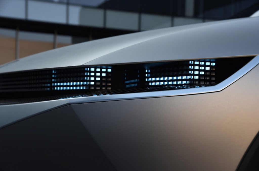 El nuevo prototipo de Hyundai destaca por ser un avanzado vehículo eléctrico, por lo que la última tecnología está visible también en el diseño. En la parte inferior de la puerta, un adorno especial destaca la capacidad de su batería de larga distancia y, a través de luces activas de led, los conductores pueden saber intuitivamente cuánto tiempo más pueden conducir incluso antes de subirse al coche. Estos elementos se han diseñado pensando en los usuarios que están experimentando por primera vez con un vehículo eléctrico.