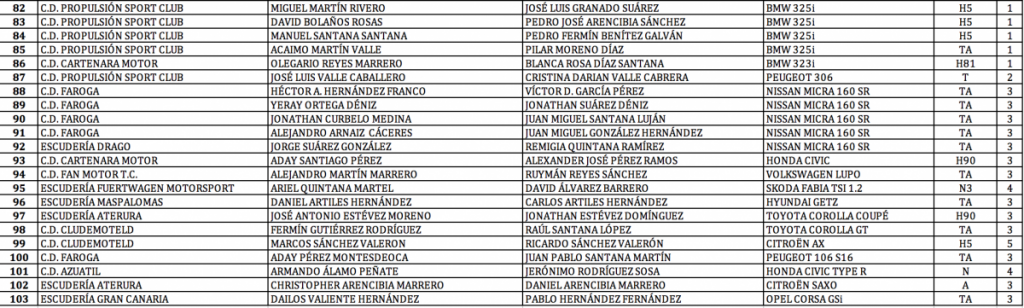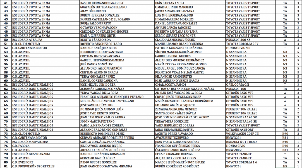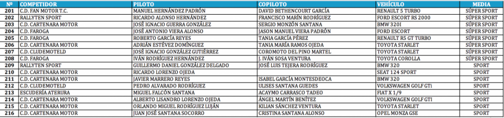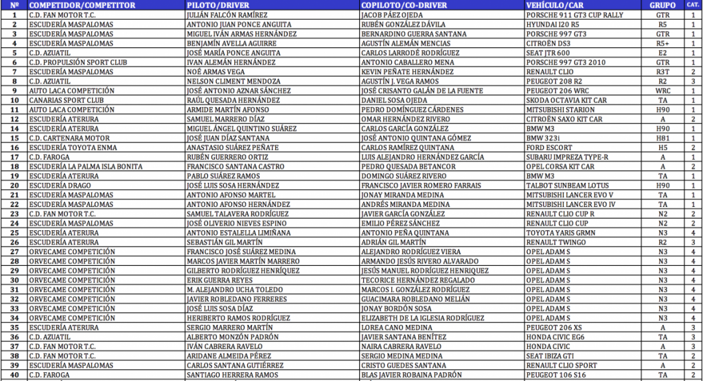Publicamos la lista de inscritos del Rally Villa de Teror, cita del Campeonato de Las Palmas de Rallys, donde se ha caído la majorera Emma Falcón (Citroën C3 R5), debido a que problemas logísticos le hacen imposible poder llegar el coche a tiempo a la isla de Gran Canaria desde la península.