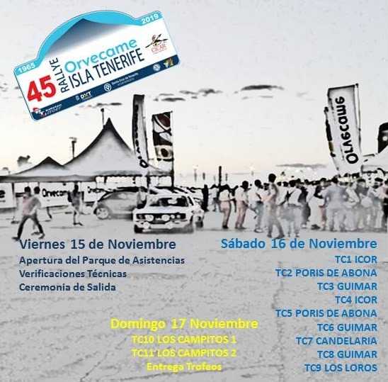 Vuelve la acción una de las pruebas más importantes del calendario regional de Rallyes de Asfalto de Canarias: el 45o Rallye Orvecame Isla Tenerife. El Club Rallyten Sport, entidad organizadora de la prueba, da a conocer un rutómetro novedoso en cuanto al esquema de celebración, y exigente en cuanto a las especiales escogidas para esta edición. Arranca así la prueba con más solera del campeonato que se celebrará los próximos 15-16 y 17 de noviembre.