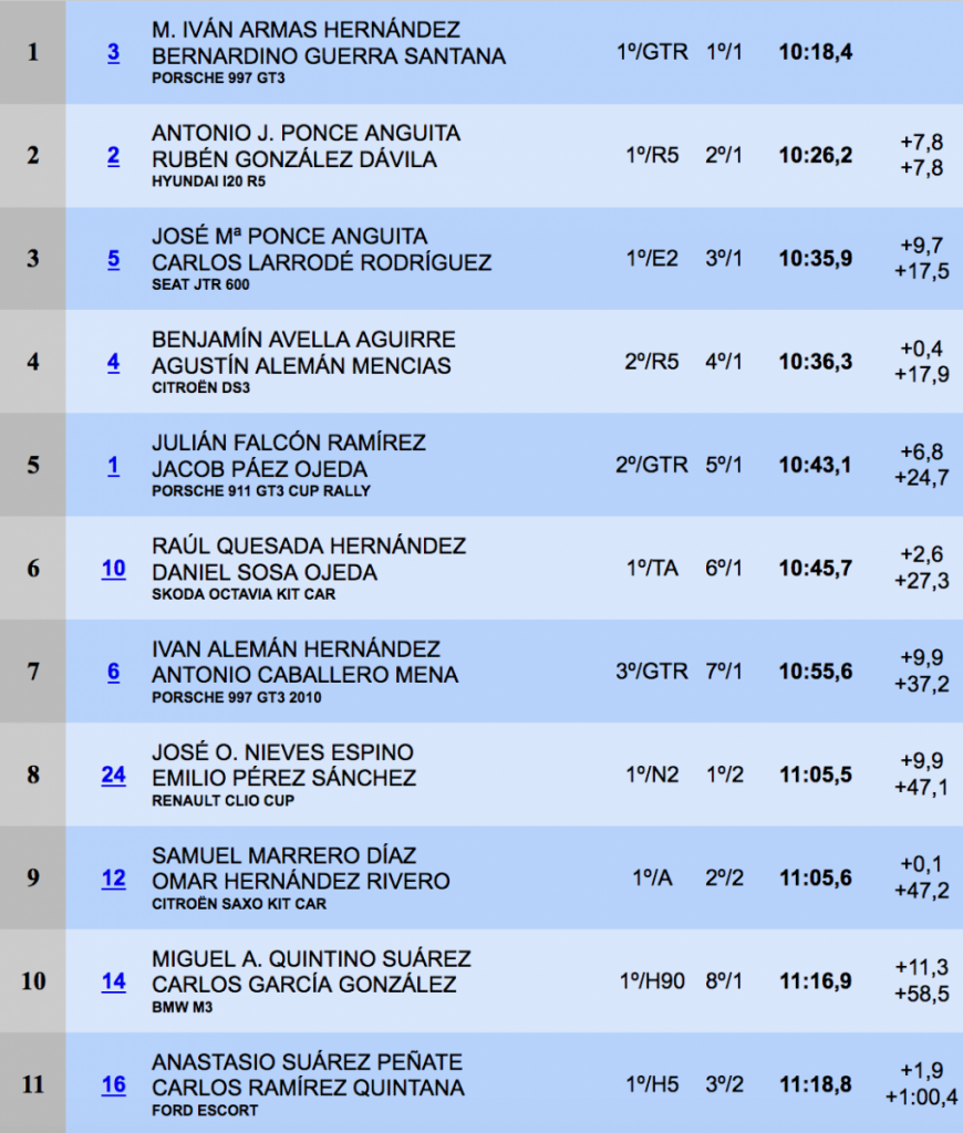 Los grancanarios Iván Armas y Tino Guerra (Porsche 997 GT3) empiezan mandando en el Rally Villa de Teror al ser los más rápido en el único tramo cronometrado del viernes, La Parranda de Teror, 14.950 metros.