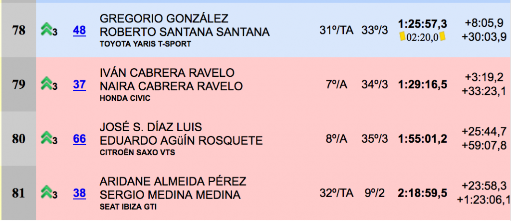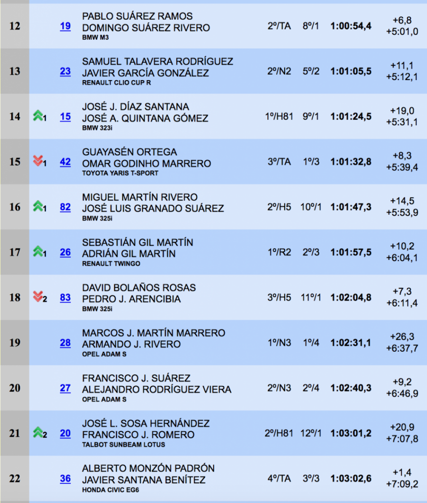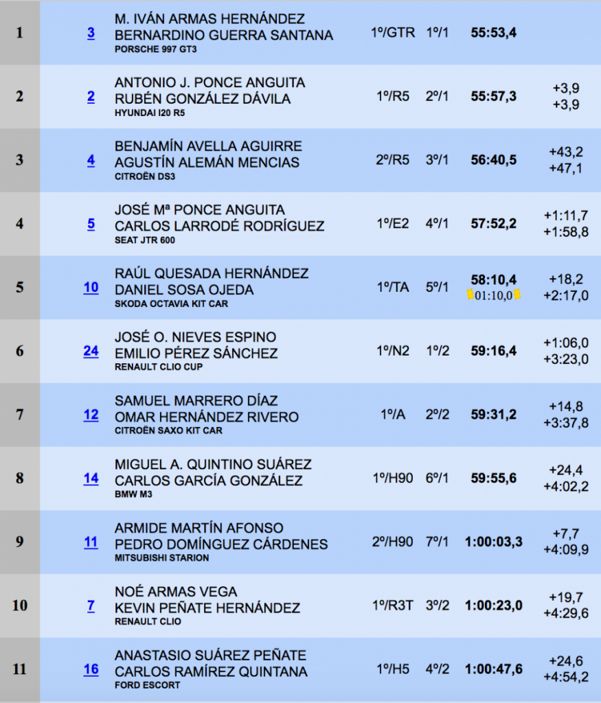 Gran carrera, una vez más, de Oliver Nieves y Emilio Pérez (Renault Clio Sport), que se alzaron con la sexta plaza de la general, seguidos, a 14.8, de Samuel Marrero y Omar Hernández (Citroën Saxo Kit Car).La octava posición fue para el local Miguel Quintino y Carlos garcía (BMW M3), seguidos a 7.7 de Armide Martín y Pedro Domínguez (Mitsubishi Starion). Las diez primeras posiciones las cerraban Noé Armas y Kevin Peñate (Renault Clio R3).