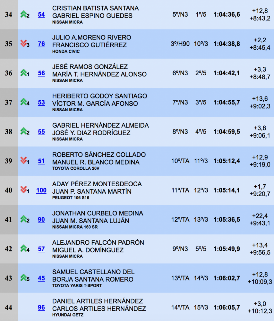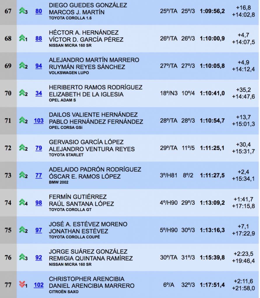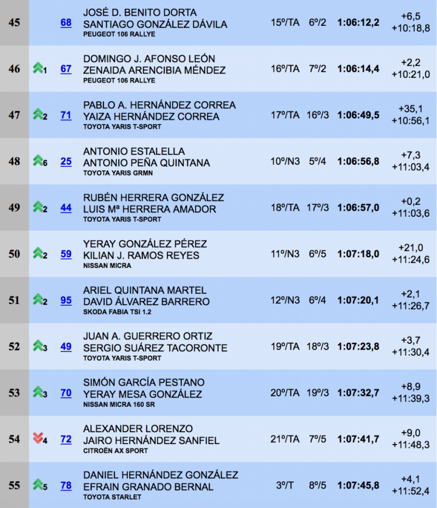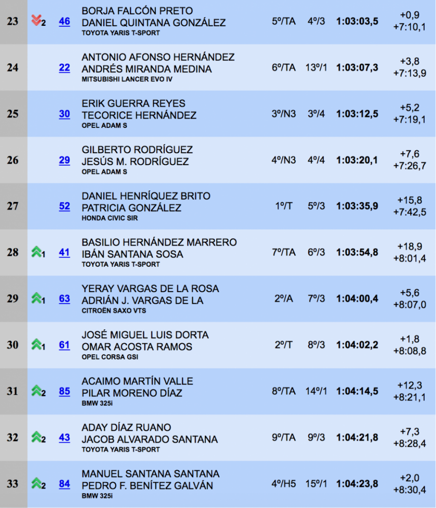 Gran carrera, una vez más, de Oliver Nieves y Emilio Pérez (Renault Clio Sport), que se alzaron con la sexta plaza de la general, seguidos, a 14.8, de Samuel Marrero y Omar Hernández (Citroën Saxo Kit Car).La octava posición fue para el local Miguel Quintino y Carlos garcía (BMW M3), seguidos a 7.7 de Armide Martín y Pedro Domínguez (Mitsubishi Starion). Las diez primeras posiciones las cerraban Noé Armas y Kevin Peñate (Renault Clio R3).