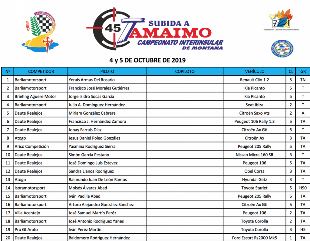 Todo apuntaba a una cifra de inscritos de vértigo y la organización no se ha equivocado. La 45 Subida a Tamaimo se ha visto arropada por un total de 109 equipos inscritos, divididos en las categorías de Turismos, Barquetas y Fórmula-Rallye. Variedad, calidad y cantidad que llenarán de colorido una prueba que, como suele ser habitual, será visitada por miles de aficionados.