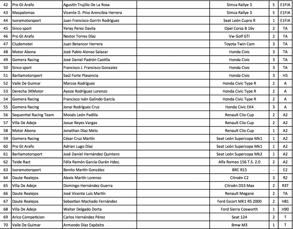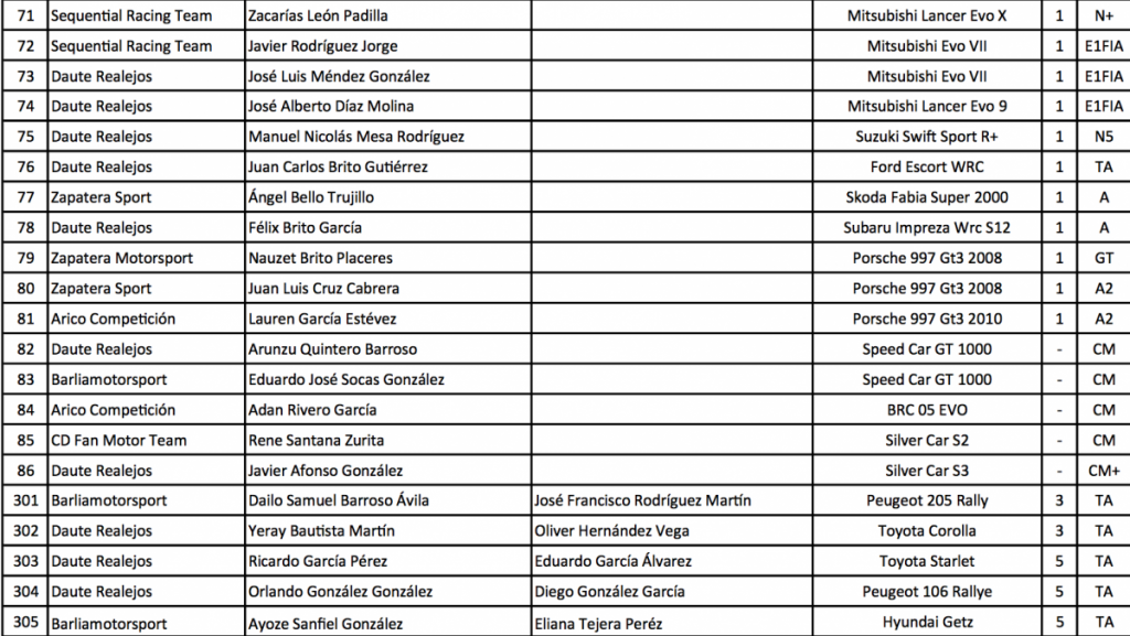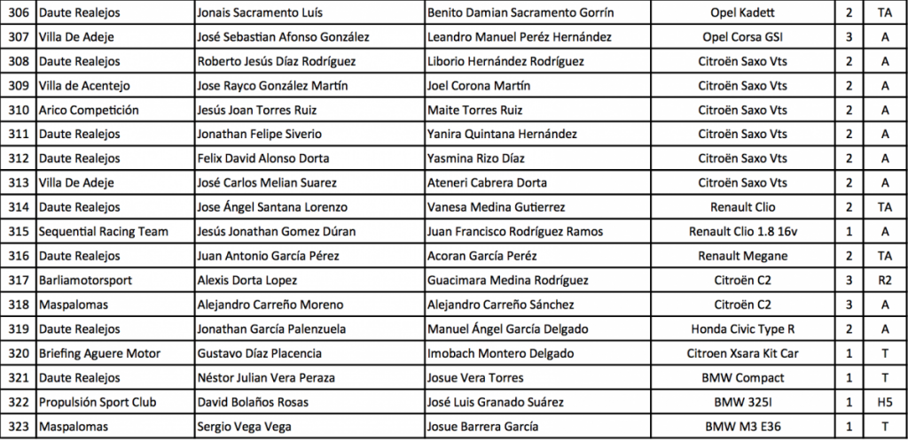 Entre los Turismos, la calidad es desbordante. Lauren García (Porsche 997 GT3 2010), Juan Luis Cruz (Porsche 911 GT3), Ángel Bello (Skoda Fabia S2000), Félix Brito (Subaru Impreza WRC S12), Manuel Mesa (Suzuki Swift Sport R+), Nauzet Brito (Porsche 997), Javier Rodríguez (Mitsubishi Lancer Evo IX), Juan Carlos Brito (Ford Escort WRC), José Alberto Díaz (Mitsubishi Lancer Evo IX) o José Luis Méndez (Mitsubishi Lancer Evo VII), son algunos de los nombres que suenan para pelear por las primeras posiciones en el apartado de Turismos.