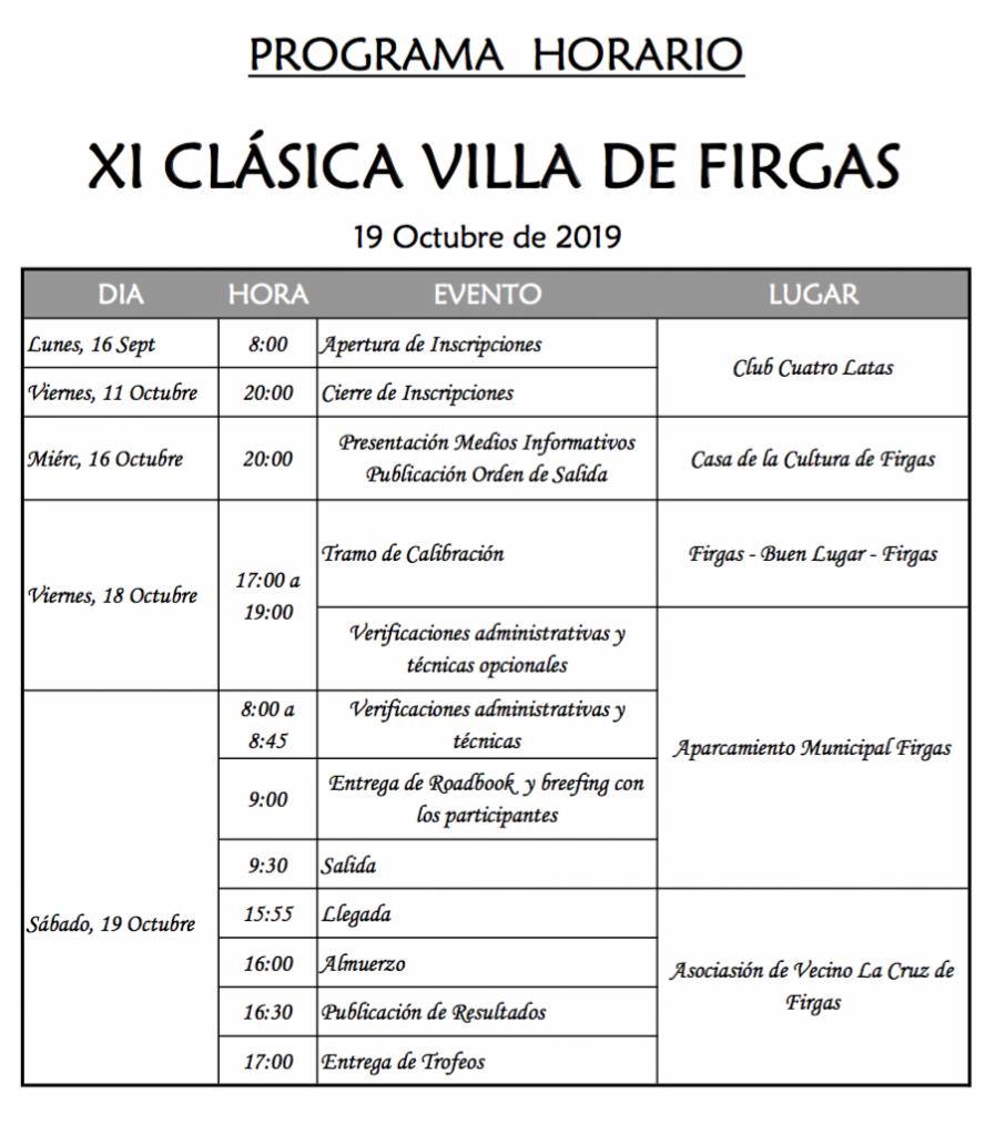 En esta edición la Clásica Villa de Firgas va a desarrollarse en una única jornada durante el sábado 19 de octubre. Tendrá como parque de salida el aparcamiento municipal de Firgas donde se realizarán las verificaciones administrativas y técnicas el mismo sábado de 8 a 8:45 de la mañana, no obstante, el viernes 18 de 5 a 7 de la tarde también se da la posibilidad de hacerlas aprovechando que el tramo de calibración de esta prueba tendrá salida y llegada en dicho aparcamiento municipal.