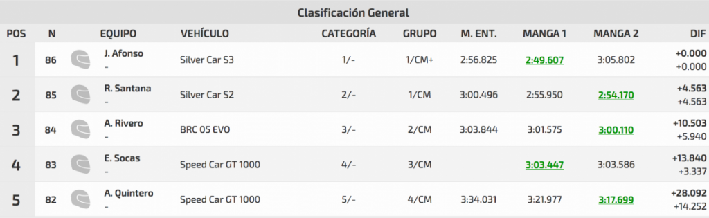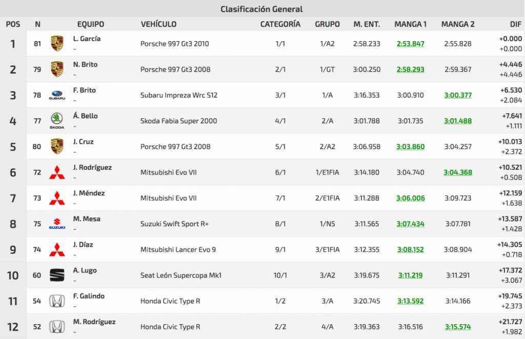 Quinto acabó el también veterano Juan Luis Cruz (Porsche 997 Gt3 2008), que acabó muy lejos de los puestos de cabeza, a 10.013 de Lauren, y con el palmero Javier Rodríguez (Mitsubishi Lancer Evo VII) muy cerca suyo, a solo 0.508.
