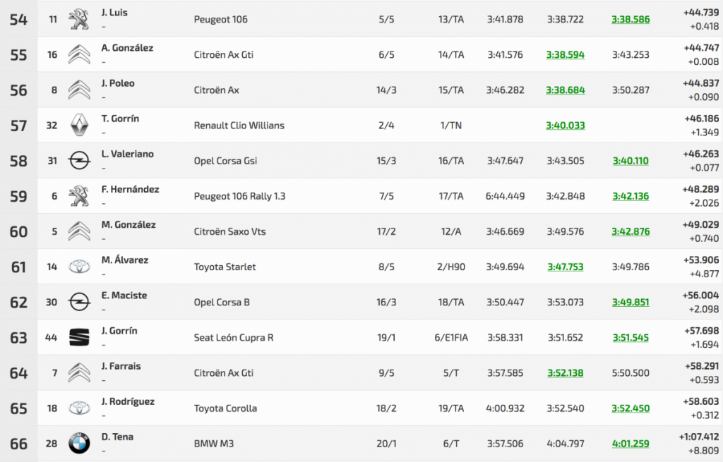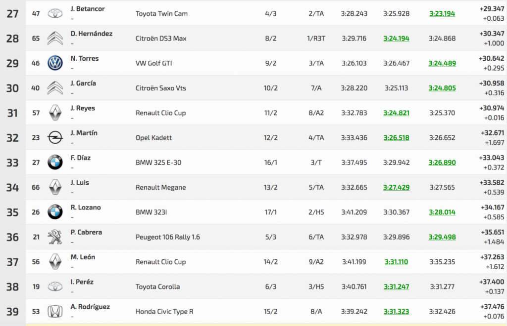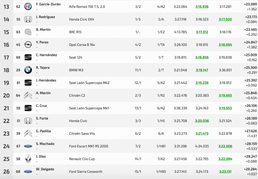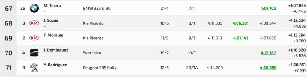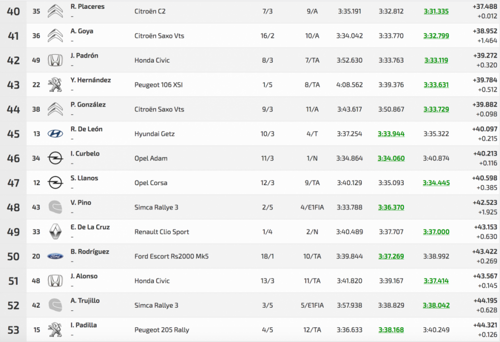 La tercera posición de la general fue para el veterano Félix Brito (Subaru Impreza WRC), que tuvo que darlo todo para superar a Ángel Bello (Skoda Fabia S2000) en 1.111 cuando en la primera oficial solo les separaba 0.825.