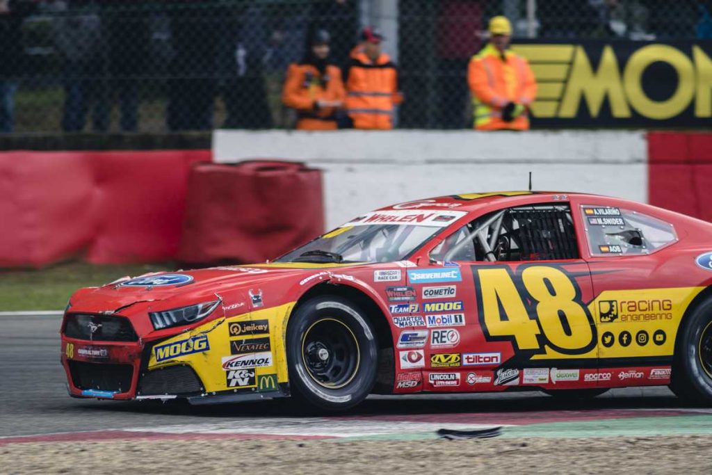 La última carrera Elite 2 de las NASCAR Whelen Euro Series 2019 en Zolder se presentaba con los pilotos de Racing Engineering, Hugo De Sadeleer y Myatt Snider, alineándose en los puestos noveno y décimo de la parrilla después de los resultados de la carrera del sábado, en la que ambos vieron arruinadas sus opciones tras recibir toques de otros competidores que obligaron a retirarse a Myatt e hicieron perder varias vueltas a Hugo. Como anunciaba el pronóstico meteorológico, había llovido y la pista estaba mojada, por lo que los coches iniciaron la carrera de 15 vueltas montando neumáticos rayados.