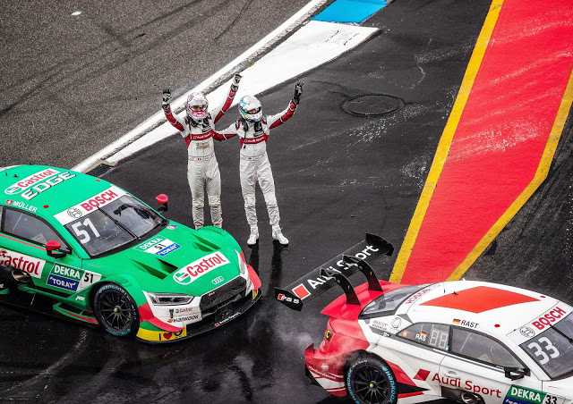 Lluvia, fuegos artificiales y una gran fiesta en Audi. En el último fin de semana de competición del DTM esta temporada 2019, la marca de los cuatro aros volvió a ser inalcanzable para sus rivales: René Rast y Nico Müller consiguieron las dos victorias en juego. El Audi Sport Team Rosberg logró el campeonato de equipos, el único que quedaba por decidir, tras haberse adjudicado Audi por adelantado el título de pilotos, y el de constructores.