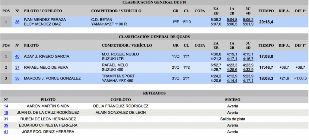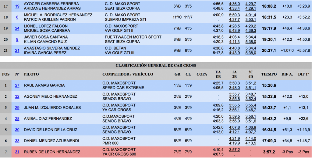 Los siempre rápidos y fiables Aníbal Hernández y Jonathan Hernández colocaron su veterano Mitsubishi Lancer Evo VI en el tercer cajón del podio, a 13,1 del liderato, a 7,9 del segundo lugar y superando en 24,1 Iriome Perdomo y Francisco Cabrera (Subaru Impreza STI), cuartos.