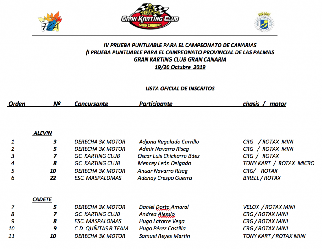 Se mantiene la expectación y sobre todo la participación en esta cita con el Karting, garantizando unas bonitas carreras en el circuito del sur de Gran Canaria, donde se contará con 6 pilotos de Alevines, 5 pilotos Cadetes, 4 Junior al que se les unirá un participante Senior y en la categoría KZ, que son kart’s con cambios, habrán 4 (3 KZ2, y 1 KZ2 Silver).