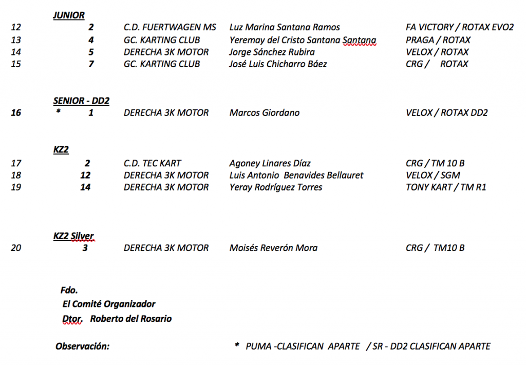 En cuanto a los campeonatos, prácticamente todo está por decidir, como en la categoría Alevín en donde Oscar Luis Chicharro es el principal favorito, o en la categoría Cadete, en donde Hugo La Torre y Daniel Dorta se lo juegan todo. Por otro lado, en la categoría Junior, Luzmi Santana deberá luchar con José Luis Chicharro para la consecución del título. Y en KZ2 y KZ2 Silver, Yeray Rodríguez y Moisés Reverón lo tendría casi hecho.
