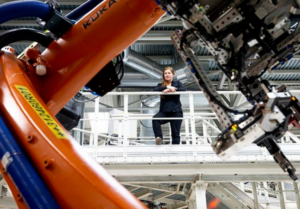 Es la primera vez que entro en una fábrica de coches y me rodeo de tantos robots. Me siento como una niña en una tienda de golosinas. Estoy muy emocionada de ver todas estas máquinas en funcionamiento a mi alrededor. Es increíble caminar por la factoría y verlos colaborando al mismo tiempo para fabricar algo tan complejo como un coche. Hasta ahora he trabajado con ellos en laboratorios, pero esto es a lo grande. Todo el edificio es un robot tridimensional.