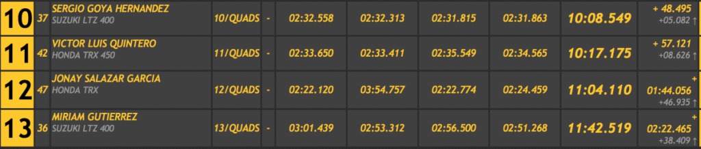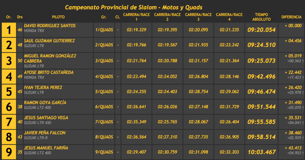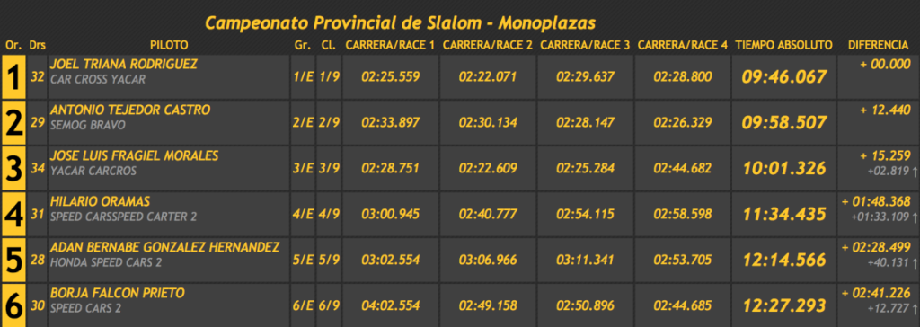 Después de las cuatro pasadas reglamentarias Triana marcó un tiempo total de 9:46.067, superando en 12.440 a Antonio Tejedor (Semog Bravo) y siendo tercero José Luis Fragiel (Yacar Carcros), a 15.259 del primer puesto, a 2.81 del segundo y a más de medio minuto del cuarto.